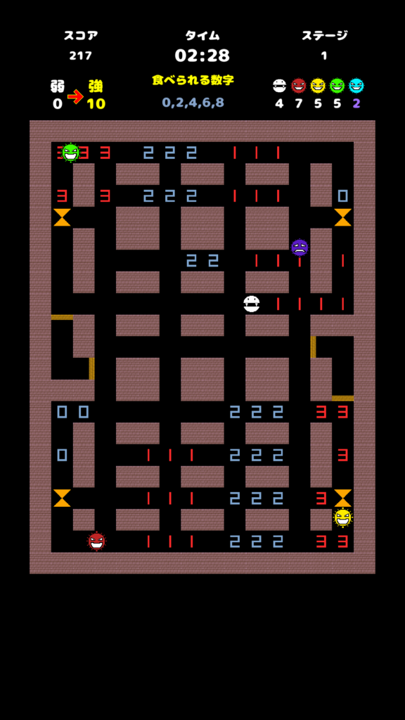 Note that not only the strength but also [Numbers that the number eater can eat] changes when the number eater or enemies touch [Hourglass] in the maze.